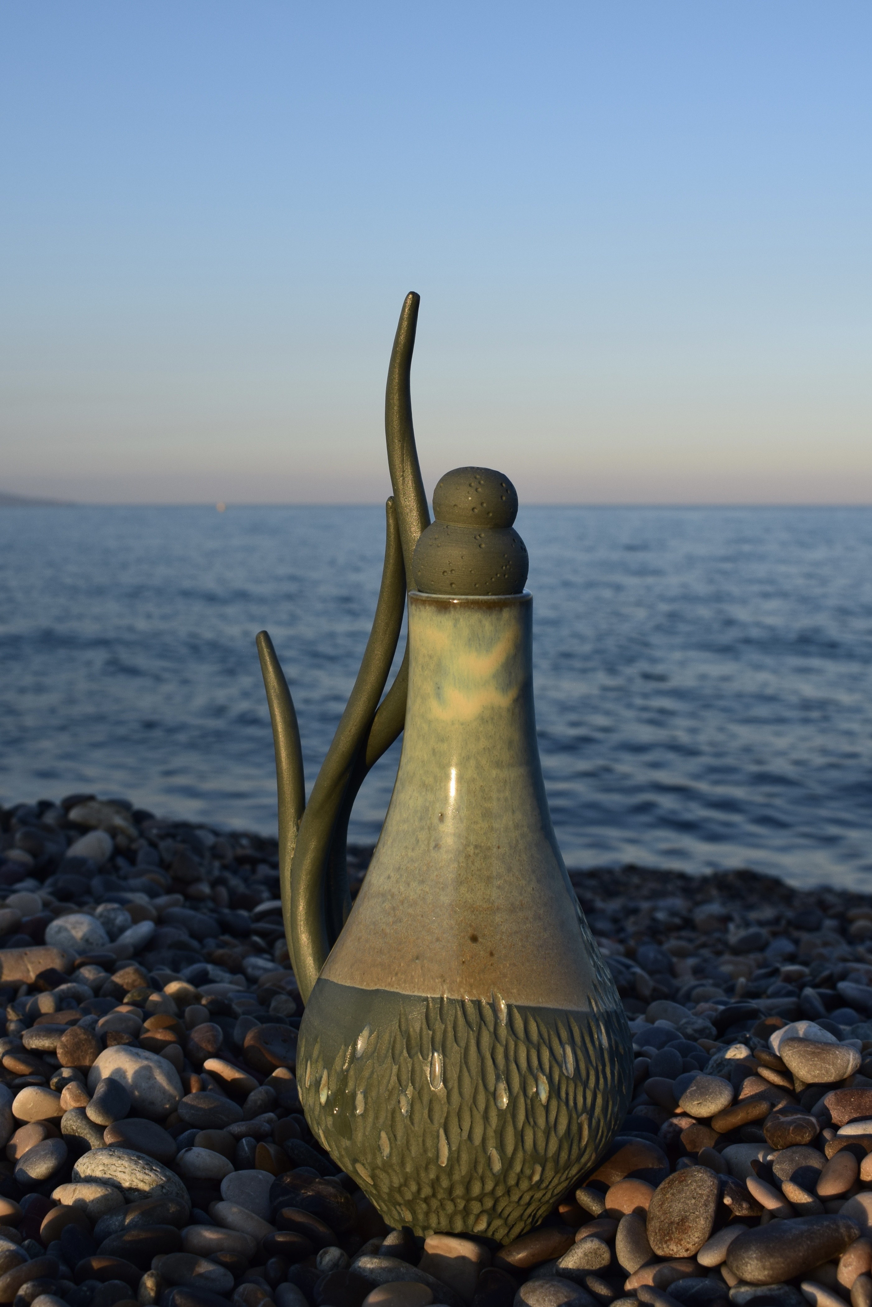 Fioles en grès aux reflets nacrés, inspirées de l'écume qui tourbillonne au creux des vagues.