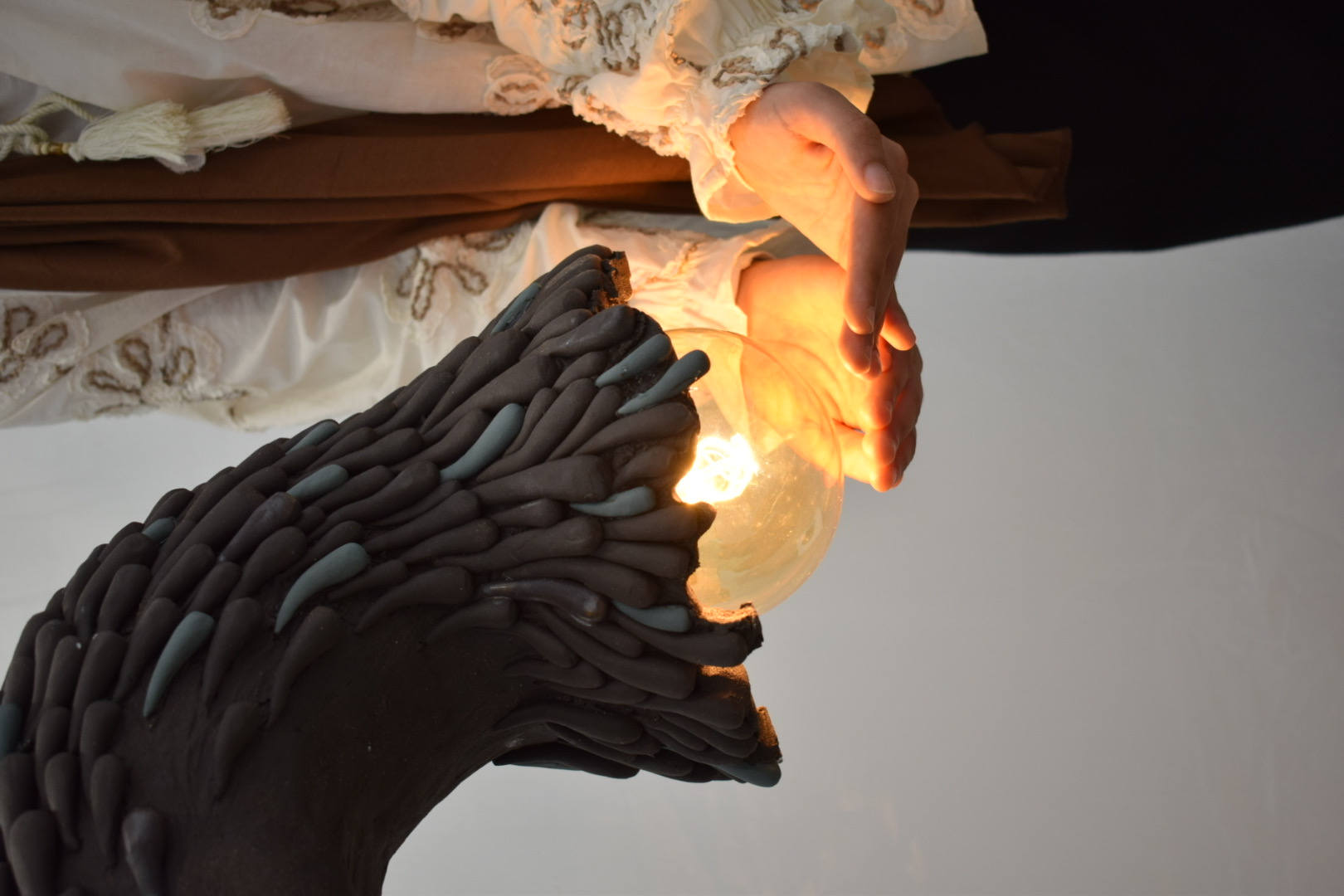 Sculpture lumineuse en grès noir, ailes de plumes modelées à la main. Pièce unique sur commande.