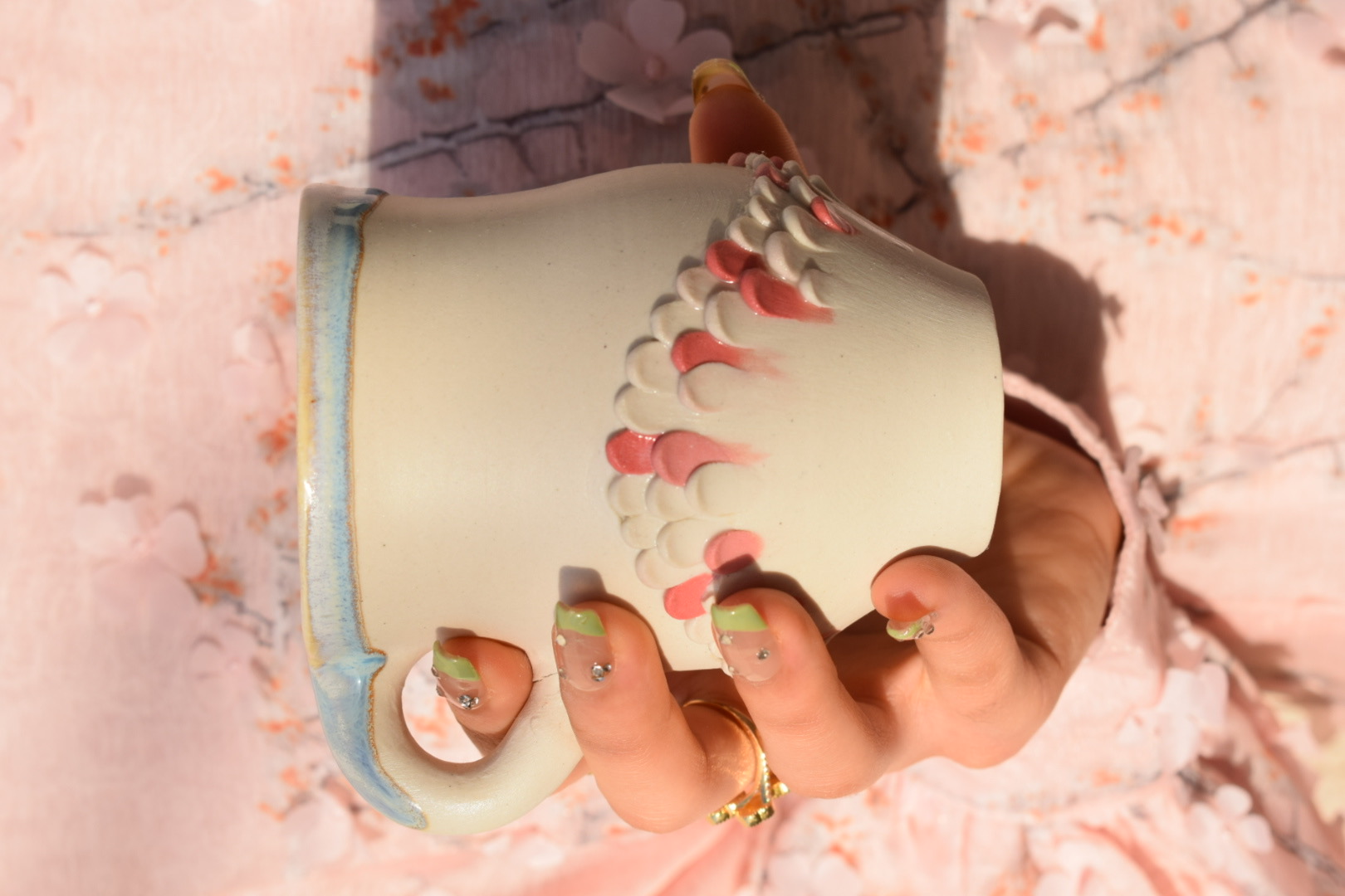 Grands mugs généreux aux reliefs floraux, pour les matins où l'on prend le temps de rêver.