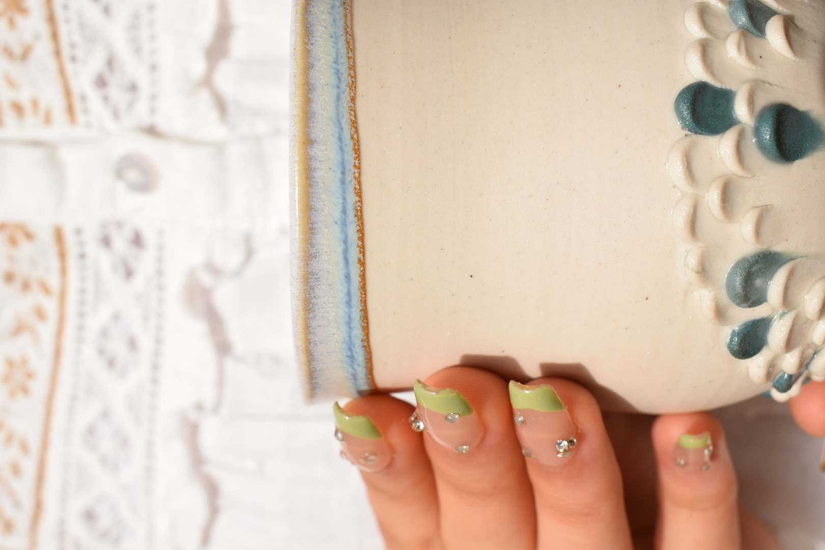 Tasses aux reliefs marins et glaçure blanc-argent, pour boire comme au bord des vagues.